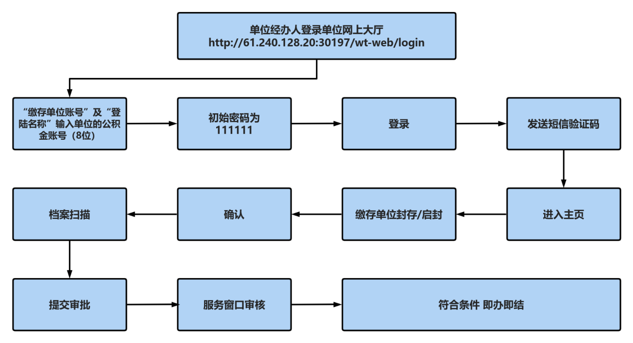 (一)单位启封线下办理流程:单位经办人携带上述材料到公积金服务窗口办理,如手续齐全,即办即结。 (二)单位启封线上办理流程: