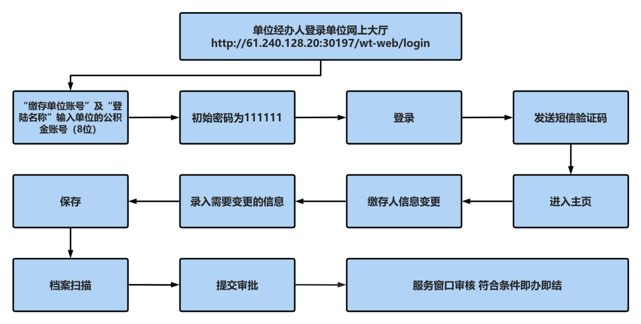 (一)线下办理流程:单位经办人携带上述材料到公积金服务窗口办理,如手续齐全,即办即结。 (二)线上办理流程: